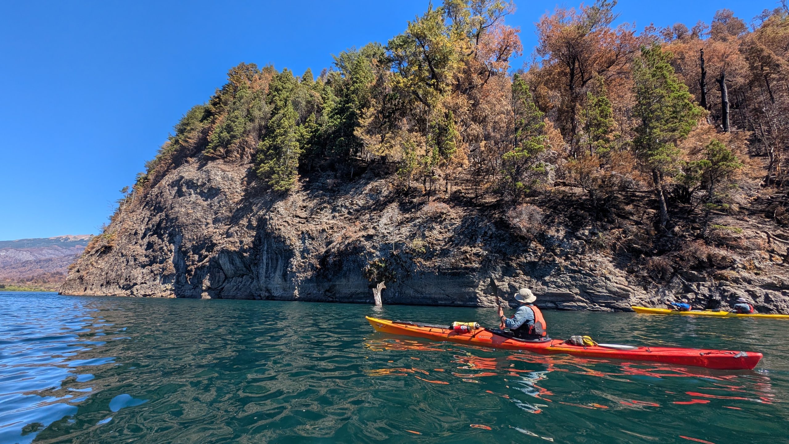 Es momento de retomar la remada, y el Lago Futalaufquen muestra su amplitud y majestuosidad, con un paisaje profundamente patagónico. Tras cinco kilómetros de travesía, el arribo en el muelle de la hostería Cumehue parece salido de un sueño.